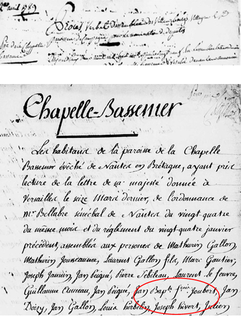Jean Hivert, un cousin de Joseph, habitant le village de la Graholière à Barbechat, lui a raconté que ce même jeudi d’avril les hommes de Barbechat ont choisi de ne pas faire appel, pour animer leurs débats comme à la Chapelle ou St Julien, au sénéchal de l’Epine Gaudin mais au notaire royal de Landemont, paroisse angevine limitrophe, Pierre Henri PAPIN…