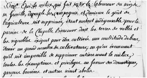 Plus particulièrement les « valliats »[5] veulent que la paroisse, soit moins sollicitée pour abonder la milice (l’armée/ jusqu’à douze hommes certaines années) qu’elle recrute parmi les pauvres travailleurs journaliers et laboureurs à bras des vignes, lin et légumes pour la plupart dans la vallée.