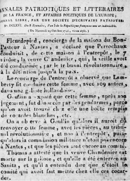 Des faits corroborés ensuite par des récits sur les noyades dans la Loire de Nantes ordonnées par Jean-Baptiste Carrier. Selon Griault[2], matelot de la douane, concierge d’une galiote «le 7 nivôse, on m’amena au moins 300 femmes avec des enfants de quatre à cinq 5 mois et même des plus jeunes… Toutes les victimes furent transférées dans un autre bateau où elles furent déshabillées les mains attachées derrière le dos. Ces femmes et ces enfants furent noyés le soir excepté la veuve Chandenier, morte sur la galiote au moment où elle allait être transférée ailleurs…