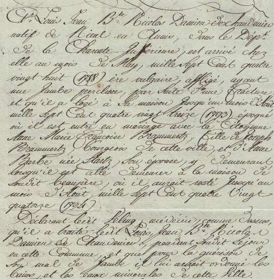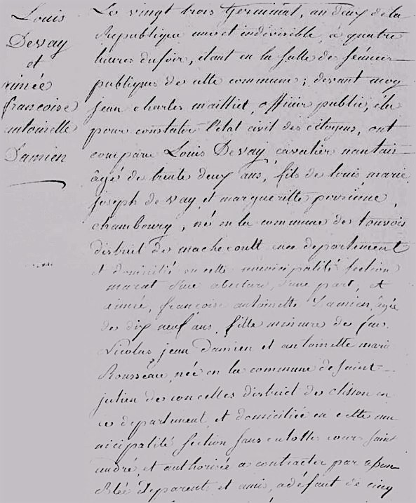 … Sont comparus Louis Devay, âgé de 32 ans, fils de Louis Marie Joseph Devay et Marguerite Perrine Chambourg né en la commune de Touvois, district de Machecoul, en ce département est domicilié en cette municipalité section Marat d’une part, et Aimée Françoise Antoinette Damien âgée de 19 ans fille mineure des Feus Nicolas Jean Damien et Antoinette Marie Rousseau en la commune de Saint-Julien de Concelles, district de Clisson en ce département et domicilié en cette municipalité section sans culotte… Cinq ans auparavant l’acte de mariage aurait fait mention du fils de Louis Marie Joseph De Vay, Chevalier des brosses, capitaine d’infanterie au régiment du Lyonnais, chevalier de l’ordre militaire de St Louis et Dame Marguerite Perrayne de Chambourg, et Aimée Françoise Antoinette Damiens de Champdenier, fille mineure de feu Nicolas Jean Damiens de Champdenier et Antoinette Marie Rouxeau de Fontenelle…
