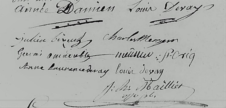 - Marie Magdeleine DAMIENS de CHAMPDENIER (1759) mariée en 1778 à Louis-joseph DEVAY de LA FLEURIAIS