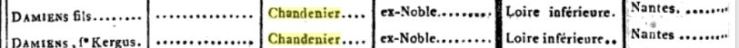 - Jeanne Marie Madeleine DAMIENS de CHAMPDENIER (1765) mariée en 1781 avec le Chevalier François Sébastien DE KERGUS, seigneur de KERESTANG