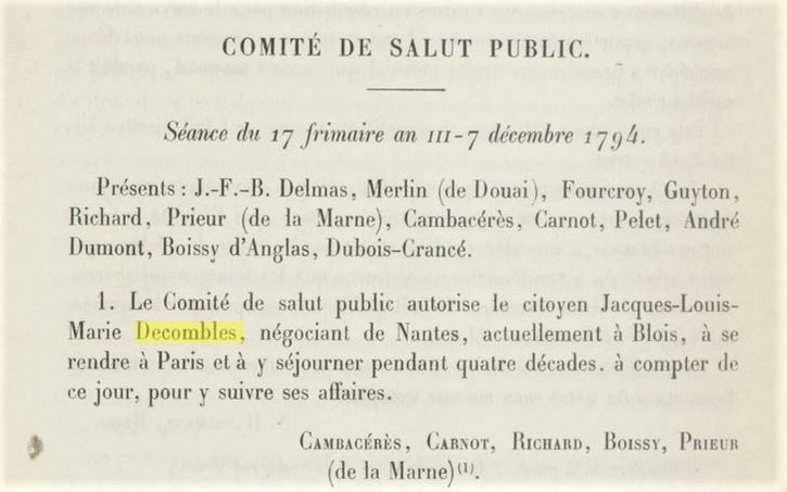 Seul Jacques de COMBLES marié à Marie Victoire de CHAMPDENIER a pu faire reconnaitre son activité de commerçant par le comité de salut public fin 1794.