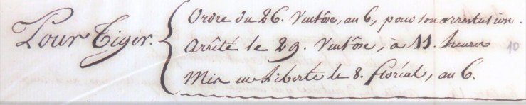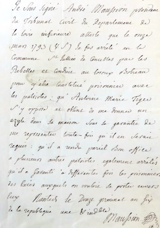 De même Julien et Joseph ont évoqué ensemble la rapide détention au printemps 1798 de l’ancien procureur du Gué au Voyer, Antoine Marie Tiger. Le 19 mars 1798, il est arrêté sur ordre du général commandant le département, conduit par trois gendarmes à la prison du Bouffay et jugé pour fait de « participation à la première insurrection des guerres de Vendée ».