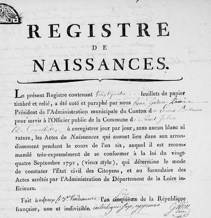 | Registre des naissances St Julien de Concelles de l’an 6 Archives départementales 44 |