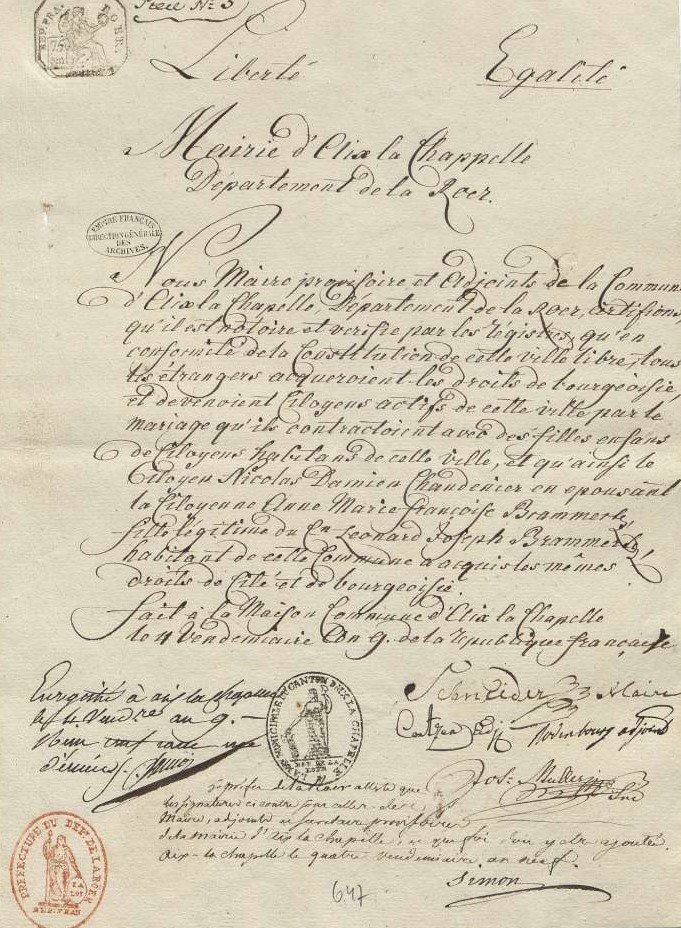 Cette année là, l’an I de la république, ses trois filles ainées sont mariées. Son fils Louis Jean-Baptiste, son fils est parti trois ans auparavant, âgé de 19 ans, pour Aix La Chapelle. Comme le rapporte le notaire de la ville « il est arrivé au mois de mai 1788 ayant une jambe percluse suite à une fracture. Le dit Veling, médecin, l’a traité pendant le séjour sur la commune et lui a ordonné les bains et les eaux thermales de la ville[1]. En 1793 il est rentré en mariage avec la citoyenne Anne-Marie Françoise Brammertz, fille de Joseph Brammertz, un bourgeois de la ville ».