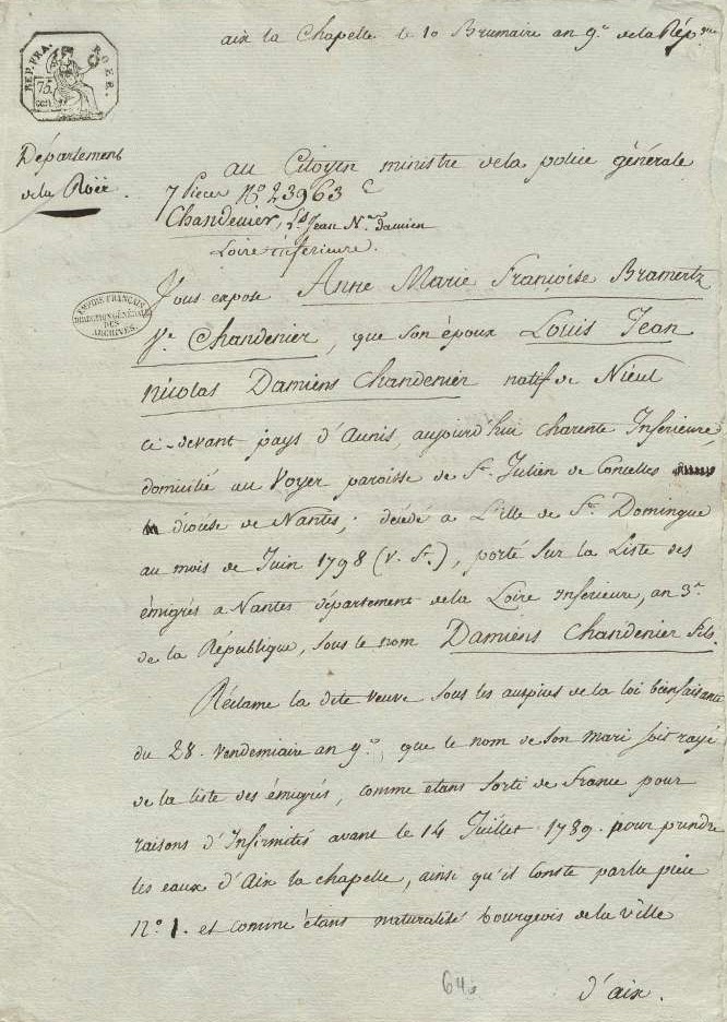 « Réclame sous les auspices de la loi bienfaisante que le nom de son mari soit rayé de la liste des émigrés comme étant sorti de France pour des raisons d’infirmités avant le 14 juillet 1789 pour prendre les eaux d’Aix-la-Chapelle…. »