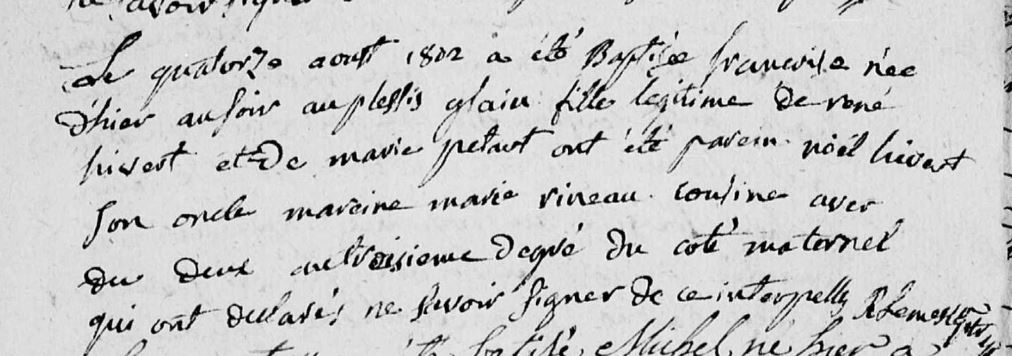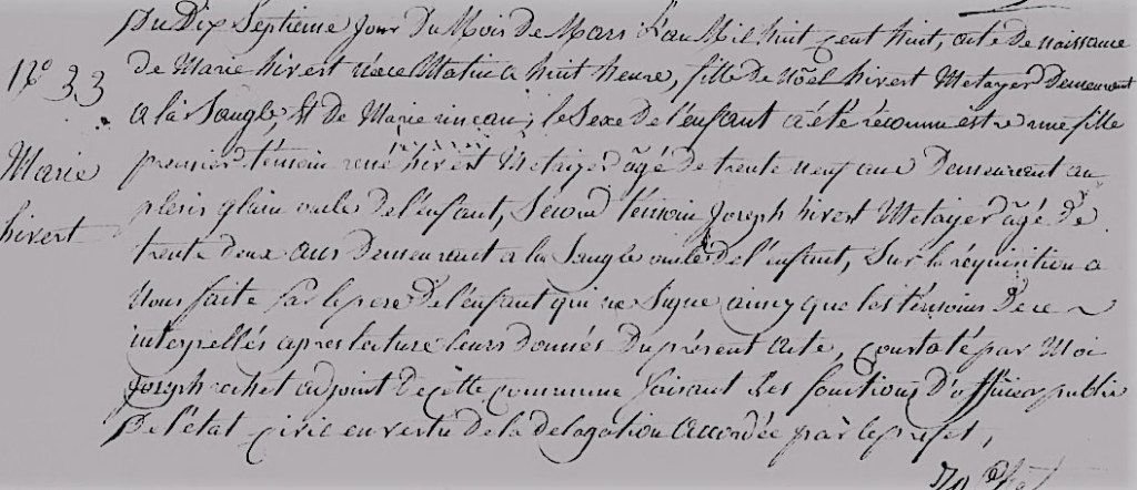 Marie fille de Jean RINEAU et de Jeanne SECHER demeurant au Chêne à Saint Julien a juste 13 ans quand elle rencontre Noël Hivert en 1802 pour la première fois, à l’occasion du baptême, de Françoise, la deuxième fille de son frère aine René Hivert.