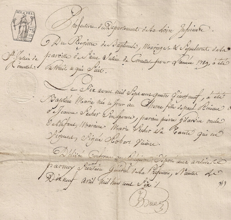 L’an 1806, le 5 juin, par devant nous, Pierre, Marie PHELIPPES, adjoint et officier de l’état-civil de la commune de Saint-Julien de Concelles, département de la Loire Inférieure, canton du Loroux-Bottereau, sont comparus Noël HIVERT, laboureur, âgé de 28 ans, né de la commune de la Chapelle Basse mer en ce département le 25 décembre 1777, domicilié de la dite commune, majeur, fils de feu Joseph HIVERT, décédé à la Chapelle Basse mer le 18 ventôse an 11, ainsi qu’il est constaté par l’acte de décès délivré même commune de 26 thermidor an 11, signé VALIN, maire et de Marie BAGRIN, présente et consentante, domiciliée aussi de la dite commune ; et Marie RINEAU, âgée de 16 ans, née en cette commune le 6 août 1689, domiciliée de cette commune, mineure, fille des feus Paul RINEAU et Jeanne SECHER, décédés en cette commune ainsi qu’il est constaté par actes de décès par nous délivrés le 10 mai dernier, autorisée de ses parents par acte de délibération, fait devant le juge de paix de ce canton en date du 5 mai dernier, enregistré au Loroux le 7 mai suivant, signé à l’expédition DRINGOT, greffier. Lesquels nous ont requis de procéder à la célébration du mariage projeté entre eux, et dont les publications ont été faites les dimanches 11 et 18 dernier, devant la principale porte de notre maison commune, et de celle de la Chapelle Basse mer, suivant le certificat de la mairie de la dite commune, délivré ce jour, signé BUJEAU, et affiché aux termes de la loi.