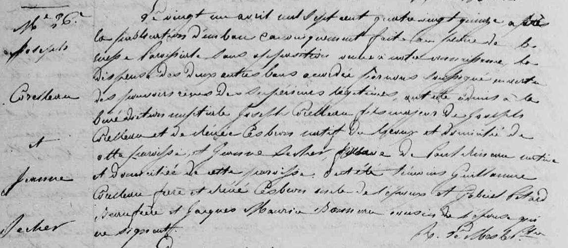 Remariée à Joseph CORALLEAU en avril 1795, sa mère Jeanne SÉCHER décède 5 ans après laissant ainsi Marie et Jean ses enfants, orphelins.