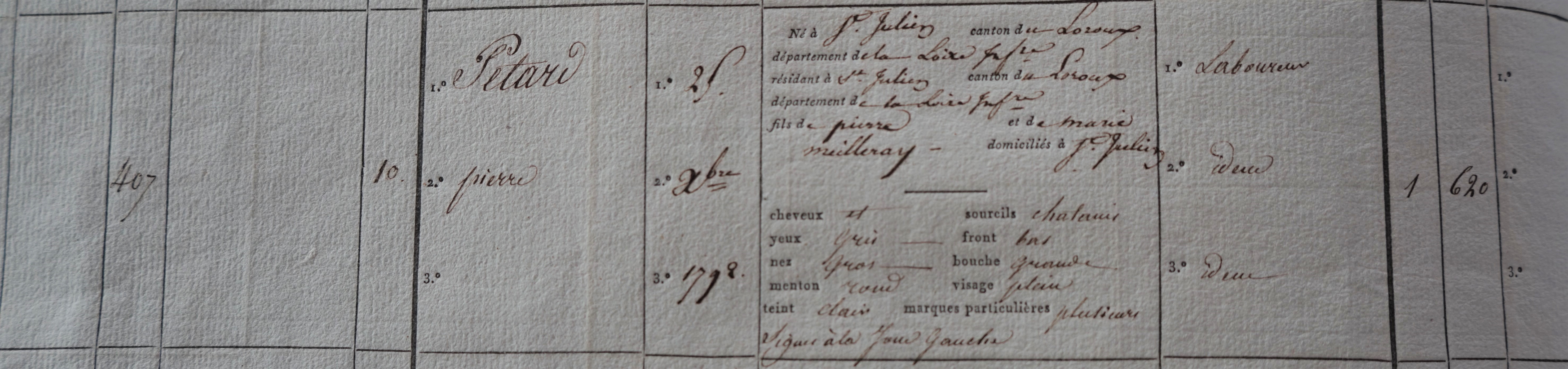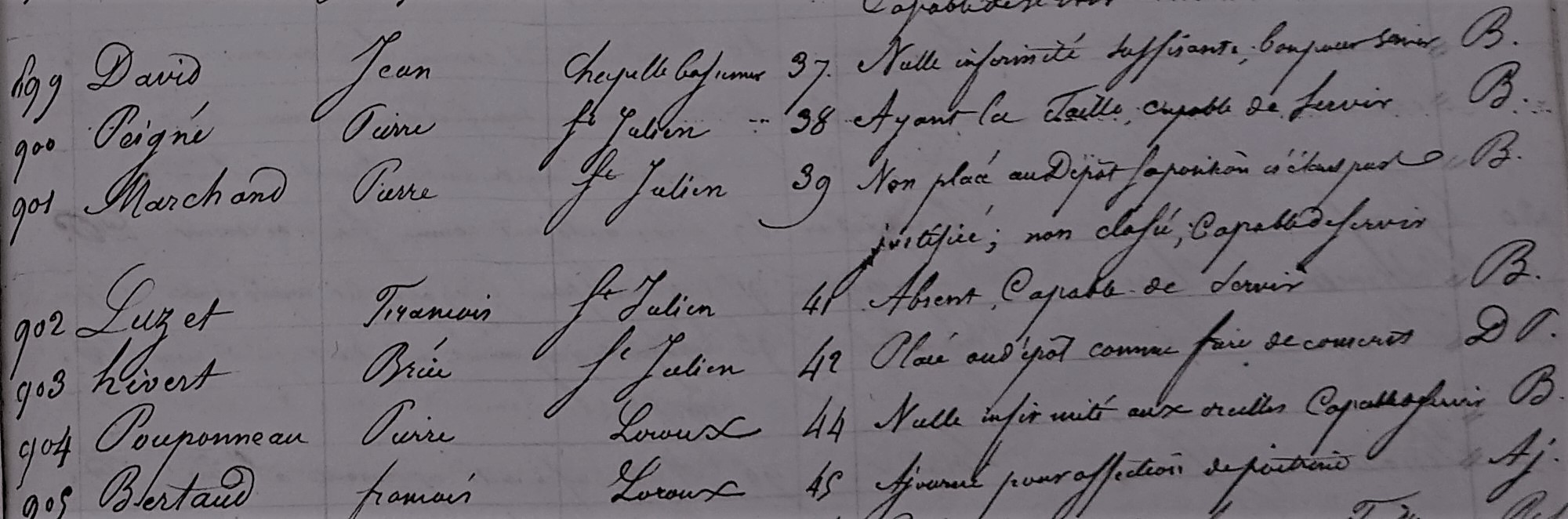 Ensuite DE CURSAY, auditeur, sous-préfet du 4ème arrondissement de Loire-inférieure procède à un tirage au sort et chacun hérite d’un numéro de rang. Jean est tiré au sort en 73ème position. Pierre Pétard, son ami et voisin, hérite du numéro 10, synonyme de recrutement à coup-sûr, si on ne peut justifier d’une situation familiale délicate ou d’une infirmité réelle.