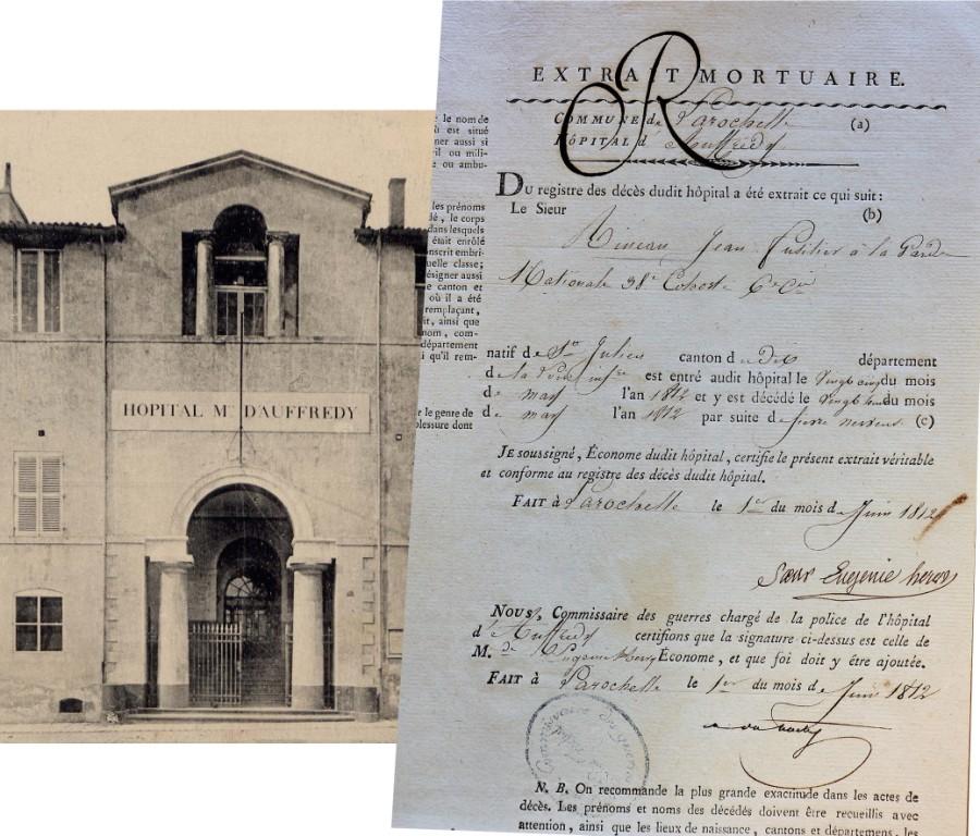 A la mi mai Jean se plaint de forte fièvre et il est transporté à l’hôpital Auffredy de La Rochelle le 25 mai 1812. Il y est décède de « fièvre nerveuse » le 28 mai.