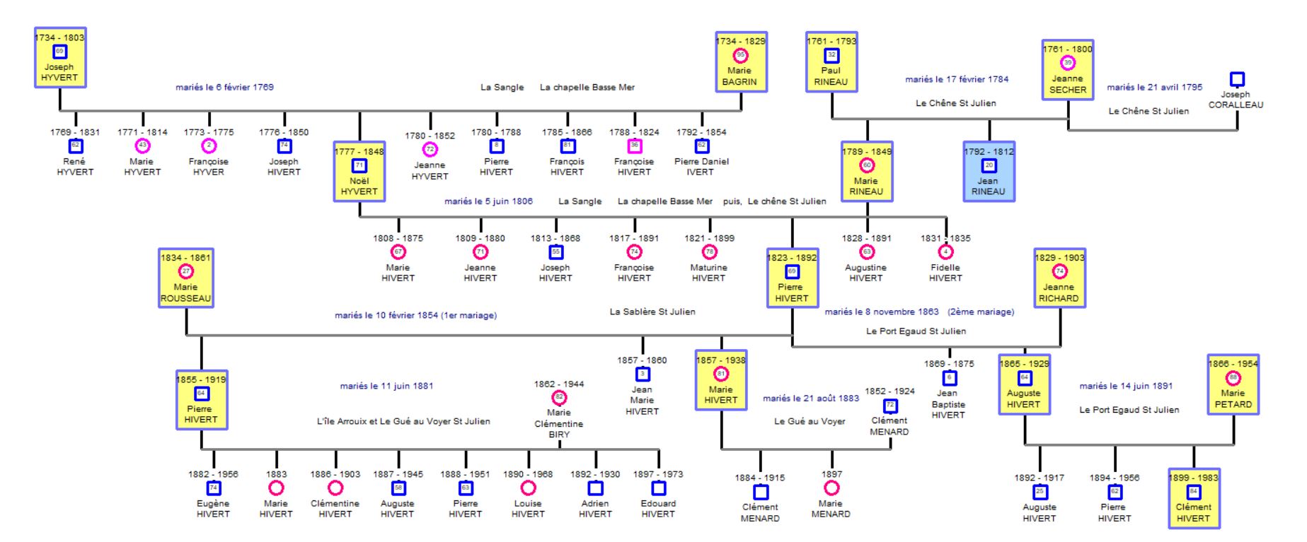 Au maternel : René Hyvert, métayer cousin germain à cause de Marie Pétard sa femme et subrogé tuteur demeurant au Plessis- Glain en la commune de Saint-Julien de Concelles, Noël Hyvert, métayer, beau frère à, cause de Marie Rineau sa femme demeurant à la Sangle commune de La Chapelle-Basse-Mer.