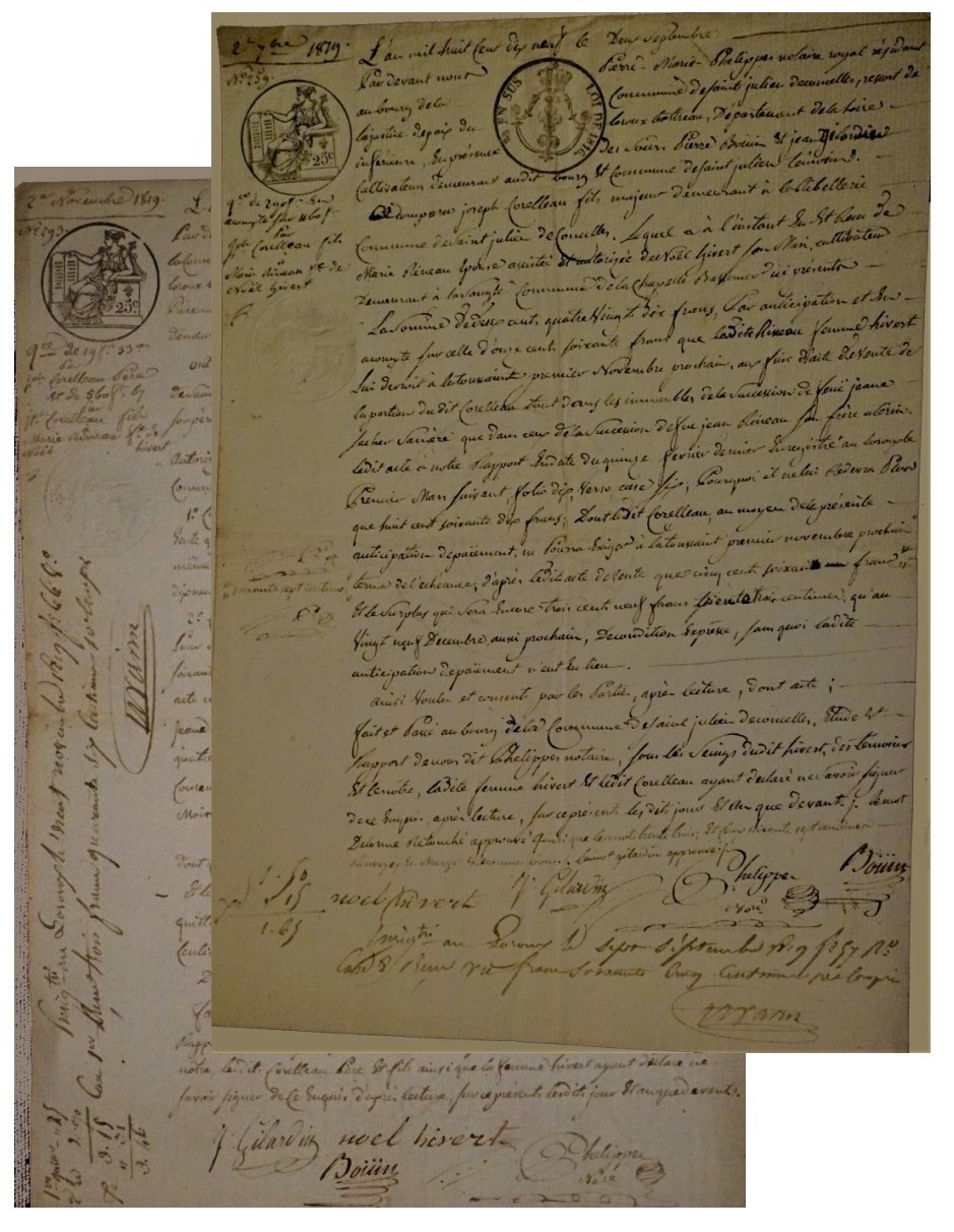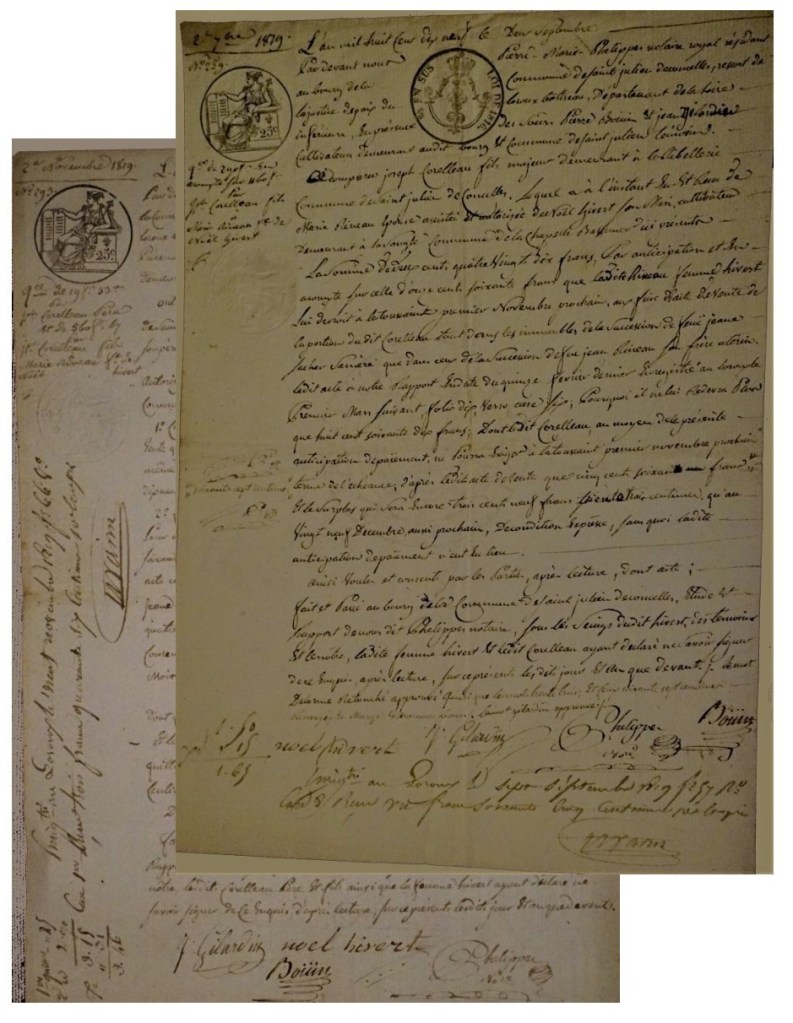 En effet le rachat de la part de l’héritage du 1/3 de son beau-père CORALLEAU se composait « tant en maison, terres labourables, prés, pâture aux et marais situés dans les communs de St Julien t du Loroux ». S’y ajoute quelques arpents de vigne dans l’Ouche du chêne et des terrains dans le bas village du chêne et des prés dans le marais du même nom, « soit 1020 francs à payer à payer aux mains du vendeur à la Toussaint prochaine, soit 1 novembre 1819 ».