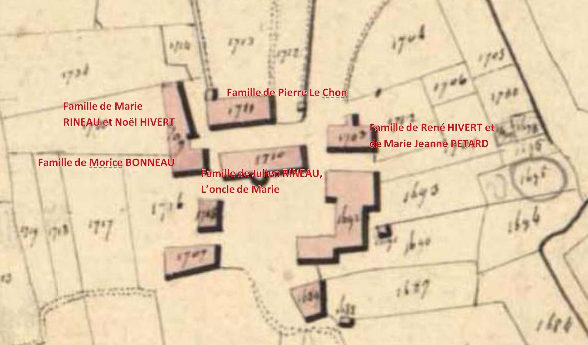 Pierre est né dans la maison jadis occupée par les parents de Marie. En effet avec Noël ils ont racheté en 1819 la part de l’héritage à Joseph CORALLEAU, celui-ci s’étant remarié en effet avec la mère de Marie, Jeanne SECHER, en 1795[1].