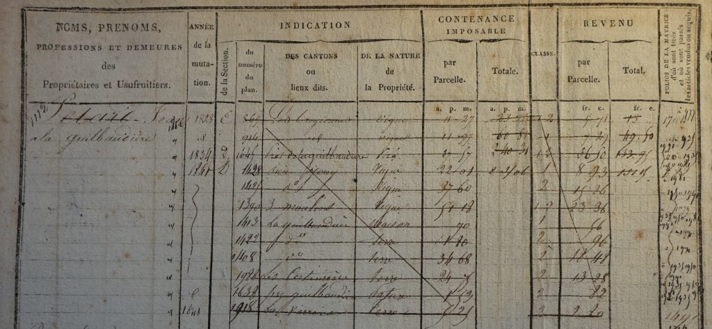 Matrice cadastrale de 1836 St Julien de Concelles – Etat des propriétés de Jean Pétard – Archives départementales de Loire-Atlantique