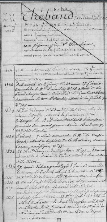 « Nous sommes partis le 13 mai 1830 de Paimboeuf avec un équipage impressionnant de 46 hommes.  Le capitaine du bateau était le célèbre Michel THEBAUD, dit « THEBAUD la baleine » pour ses exploits  passés[2]