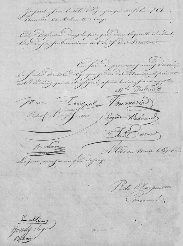 « En mars 1831, un drame est survenu avec le trépas en mer de trois de nos compagnons. La pirogue 4 s’est  retournée contre les brisants et Blais, Montaguez et Collet ont disparu. Le capitaine m’a même demandé de contre- signer le procès verbal de disparition avec le chirurgien Neveu et les seconds Tropel et Tournerie ».