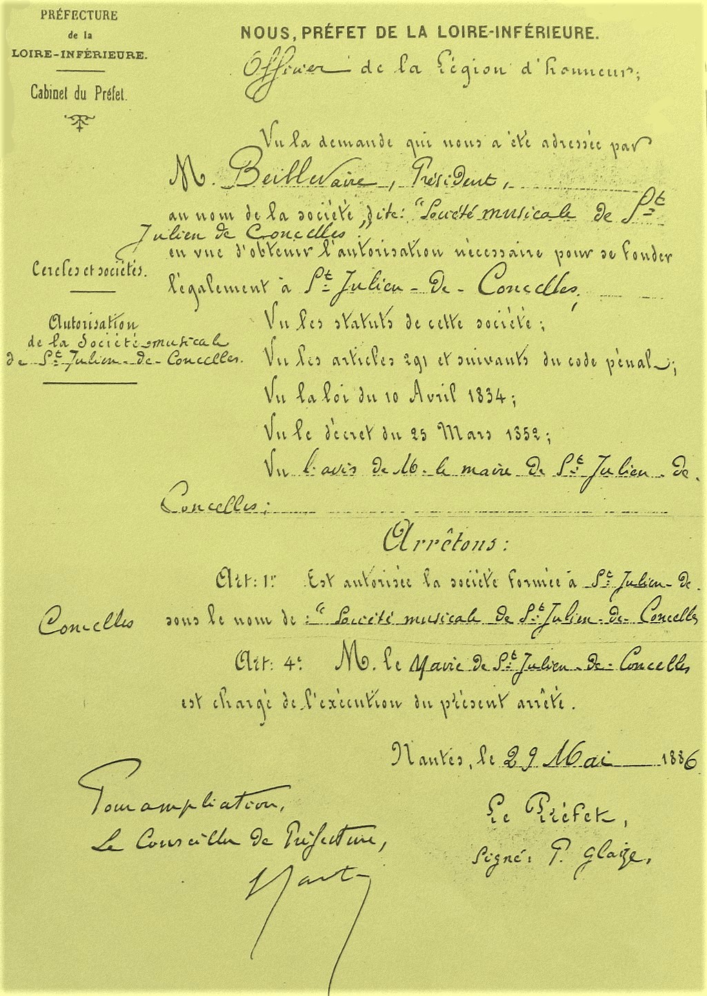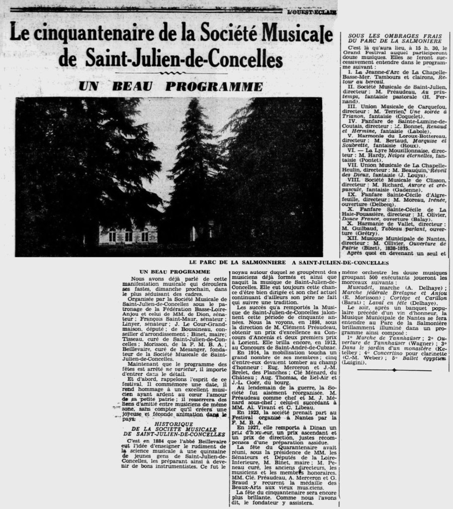 En 1934, la société musicale de Saint-Julien-de-Concelles fêtait ses 50 ans en présence de l’abbé BEILLEVAIRE… malheureusement sans la présence de Jean Marie PETARD décédé 25 ans plus tôt.