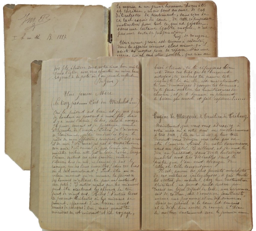 Plus tard, lors de son service militaire, et c’est ce qui surprenait son ami et conscrit Julien Lainé, il aimait remplir ses carnets de pensées, d’extraits de romans ou de poèmes de ses auteurs préférés. Les très catholiques Eugène de Margerie, Auguste Brizeux avaient sa préférence, mais aussi François Coppée et Jules Michelet, pourtant auteur « sulfureux » selon l’Eglise. Parlant du « futur » à sa fiancée Gabrielle en juin 1893, il n’hésite pas à en extraire quelques citations comme ici celle d’Eugène de Margerie dépeignant l’idéal de vie : « assez de biens pour ne pas craindre la misère, pas assez cependant pour ne pas être obligé de gagner chaque jour son pain quotidien…»