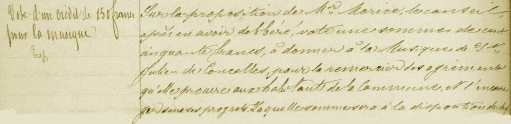 La Société Musicale est menacée de couler, dites-vous, mais vous le savez, ce n’est pas sur la question de ces pauvres instruments. Au milieu de la semaine dernière je suis allé voir Monsieur Binet, le maire. Tout me donne lieu d’espérer que tout n’est pas fini pour cette musique et que bientôt elle pourra de nouveau reprendre sa marche en avant !