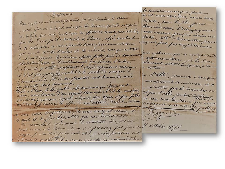« Je pensais seulement que vous vous en seriez entretenu soit avec Monsieur Cottineau ou les autres membres et que tout cela serait fait à l’amiable, pacifiquement au mieux des intérêts de chacun… Les jeunes gens qui ont mes instruments, prévenus désormais, savent que je peux les reprendre ou recevoir une légère indemnité, viendront peut-être me parler de même et tout s’arrangera peu à peu tout seul… »