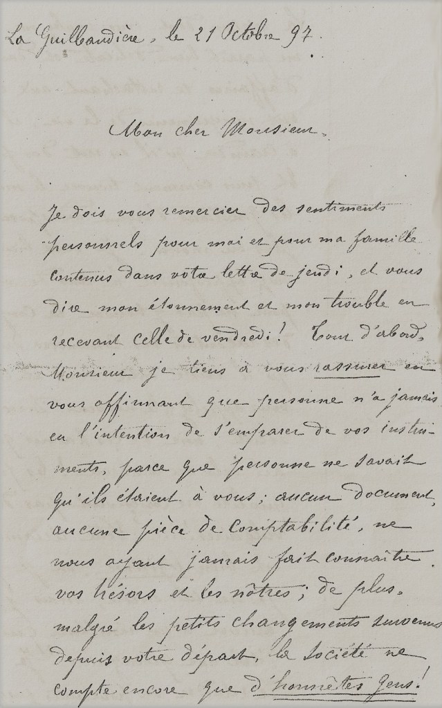 Cette dernière phrase a le dont d’exaspérer Jean-Marie qui ruminera sa réponse pendant plus de cinq jours avant de lui répondre le 21 octobre 1897 d’un « Cher Monsieur : Je tiens à vous rassurer en affirmant que personne n’a jamais eu l’intention de s’emparer de vos instruments parce que personne ne savait qu’ils étaient à vous, aucun document aucune pièce de comptabilité ne nous ayant fait connaître vos trésors… »