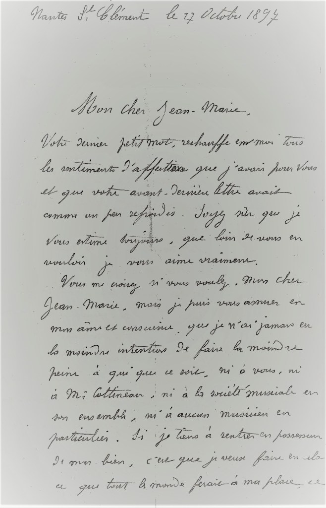 Même s’il trouve très exagéré les propos de son ami, Edouard BELLEVAIRE lui répond le 27 octobre 1897 en ces termes : « Mon cher Jean-Marie je peux vous assurer en mon âme et conscience que je n’ai jamais eu la moindre intention de faire de la peine à qui que ce soit, ni à vous, ni à Monsieur Cottineau, ni à la société musicale, ni à aucun musicien en particulier… Je n’avais pas d’ailleurs l’intention de vous causer tant de déboires, mon cher Jean-Marie, et je trouve bien lourde la charge que vous voulez bien accepter de vous occuper personnellement pour moi, de régler la question de chacun de ces instruments »