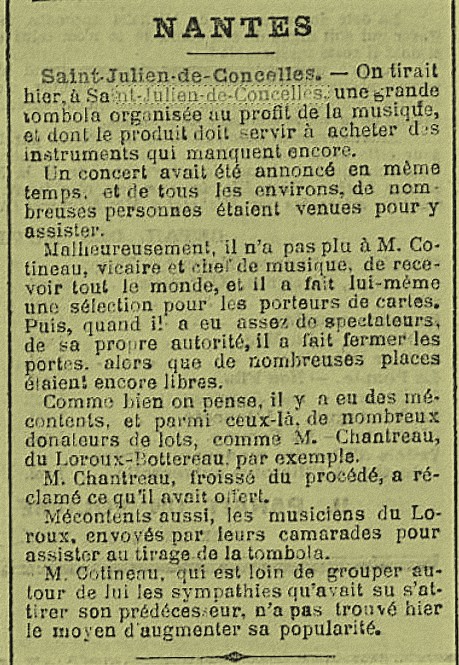 Même si François COTTINEAU, son collègue vicaire de Saint-Julien a des méthodes parfois rugueuses, selon Jean-Marie, la société musicale n’a pas à faire les frais de la mésentente entre les deux anciens collègues vicaires de la paroisse et il ajoute : « Je veux bien ne pas approfondir le sens de votre lettre pour ne pas y trouver la confirmation des racontars des commères du bourg disant qu’il existe entre vous et celui que vous appelez le nouveau “directeur de la société” une de ces haines qui vivent encore au-delà du tombeau… Les personnes de qualité ne conçoivent pas de haines vulgaires ! »
