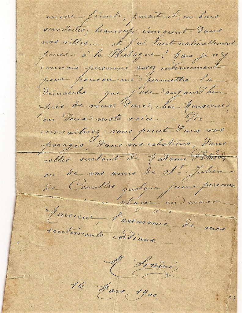 « Dans vos relations surtout de Madame Pétard ou de vos amis de Saint-Julien de Concelles y a-t-il quelques jeunes personnes désirant se placer en maison bourgeoise et connaissant un peu le service ? Je dis un peu, car nous ne sommes pas difficiles et nous n’avons pas un train de maison bien compliqué…Merci d’avance cher Monsieur Pétard et pardon de venir vous importuner avec de semblables histoires mais j’ai pensé que je pourrais m’adresser à celui que Julien me dit être l’ami de la première heure, l’ami de toujours, fidèle, dont j’entends souvent parler ».