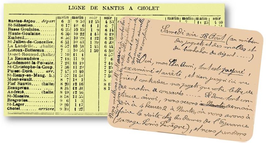 « … et nous prendrons lundi matin à 9h50 le train nous déposera à Saint-Julien de Concelles à 10h43 nous espérons vous y trouver à la gare avec vos enfants pour nous indiquer le chemin de la Guilbaudière. Vous l’avez dit mon cher ami ce sera jour de fête et ce n’est pas sans émotion que je vais vous revoir ».