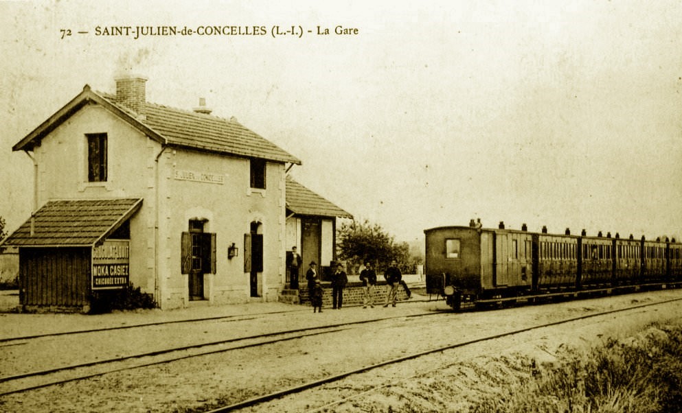 Comme annoncé le lundi matin la famille LAINE prend le train à la petite « gare d’Anjou » à proximité de l’imposante la « gare d’Orléans ». Quittant progressivement Nantes, la ligne ferroviaire devient indépendante après le passage du pont de la Vendée et rejoint Saint Sébastien, puis gagne doucement avec quelques courbes Basse-Goulaine, le village d’Embreil et enfin la gare de St-Julien après une heure de voyage.