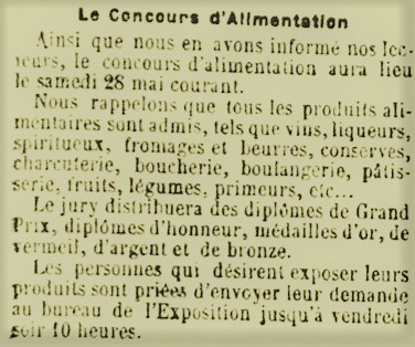 Pierre a pris soin de préparer la veille au soir dans sa malle d’osier plusieurs tommes de fromages bien affinés. Levé tôt il a pris le premier train de 7h03 à la gare de Saint Julien ce vendredi 27 mai. Pour une fois le train n’avait pas de retard et Pierre a pu parcourir rapidement à pied le kilomètre qui sépare la gare d’Anjou du « Champ de mars » et y retrouver son gendre. Julien Rousseau est bien présent à l’heure dite, sous la grande affiche de l’entrée de la rue Carnot, muni de deux cartes officielles blanches, sésames qui leur permettront de visiter l’ensemble de l’exposition.