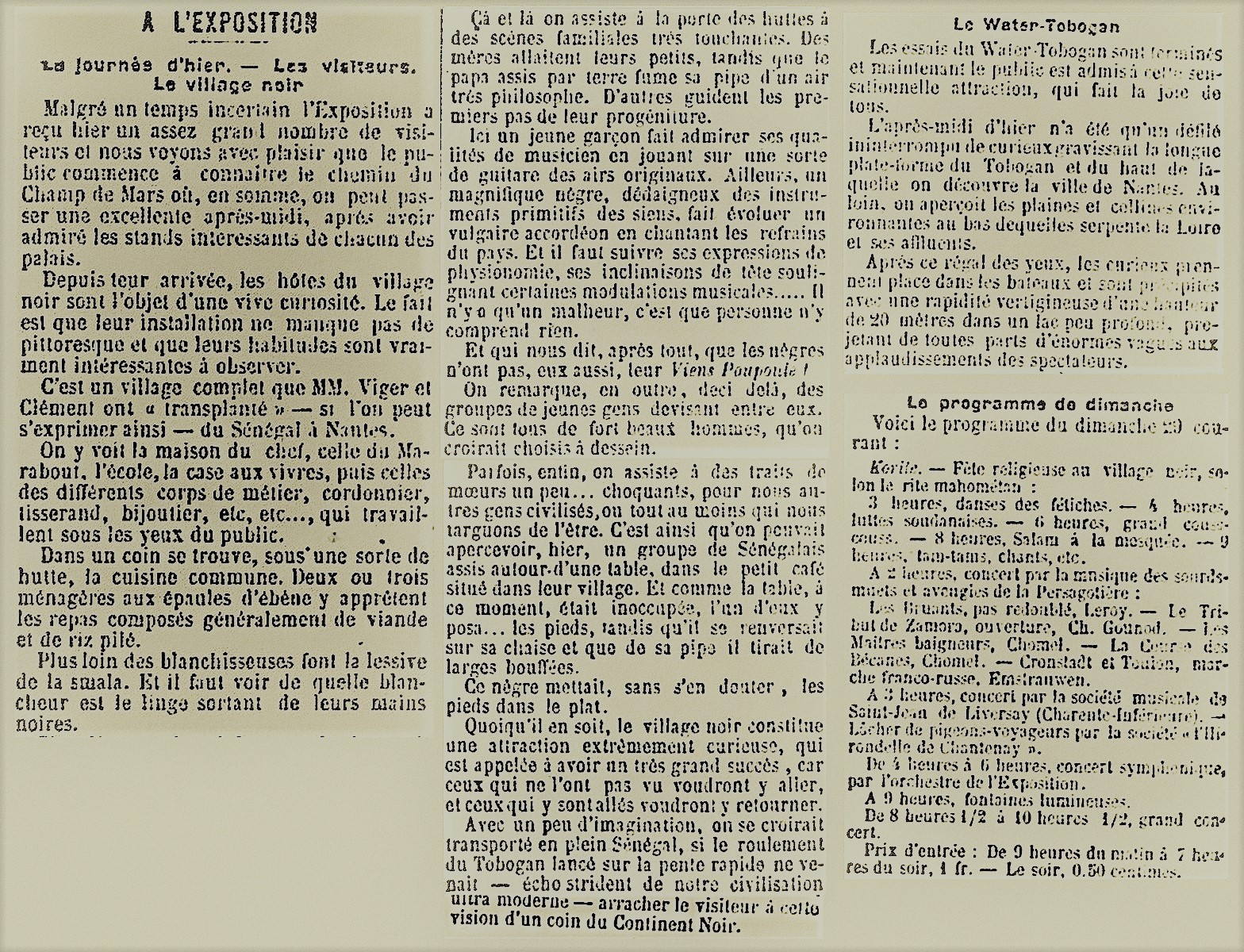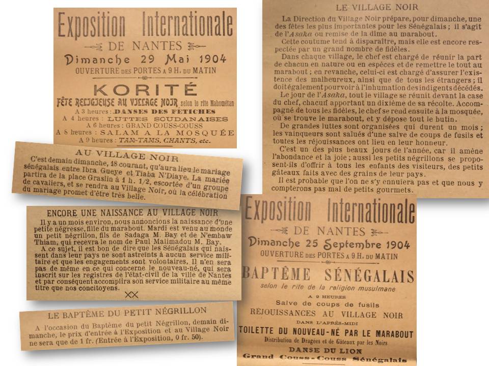 Ensuite, abonné au journal « Nantes exposition » pour connaître entre autres les résultats du concours culinaire, Pierre suivra au fil des semaines les événements du village noir, mariage, baptême du bébé « négrillon », prière à la mosquée, fête de la Korité…