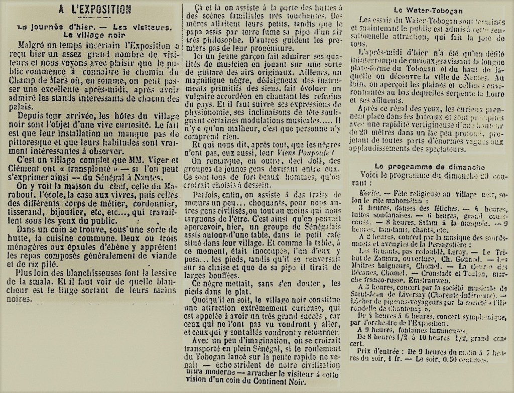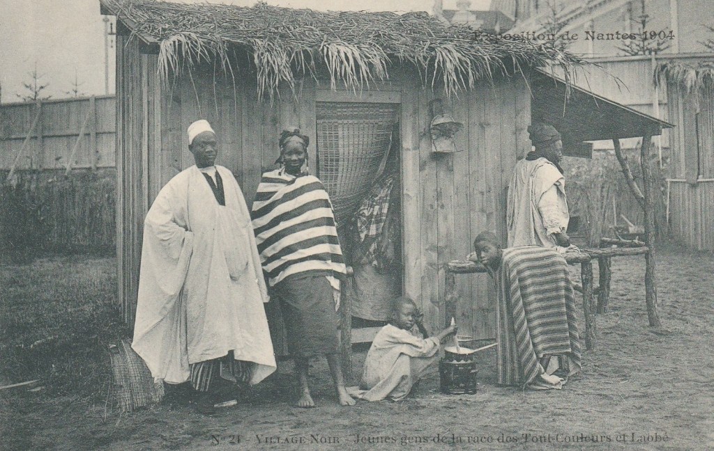 [2] À Paris, entre 1877 et 1912, une trentaine « d’exhibitions ethnologiques » auront lieu au Jardin zoologique d’acclimatation. La province suit. C’est dans cette dynamique que se structurent, très rapidement, les troupes itinérantes, passant d’une exposition à une foire régionale, que se popularisent les célèbres Villages Noirs (ou Sénégalais). Ces zoos humains sont mêmes acceptées par la Société d’anthropologie et par la quasi-totalité de la communauté scientifique française. Peu d’hommes politiques et de journalistes y trouveront à redire et ce malgré des conditions sanitaires et de parcage souvent catastrophiques. Nantes étonnante de Stéphane Pajot