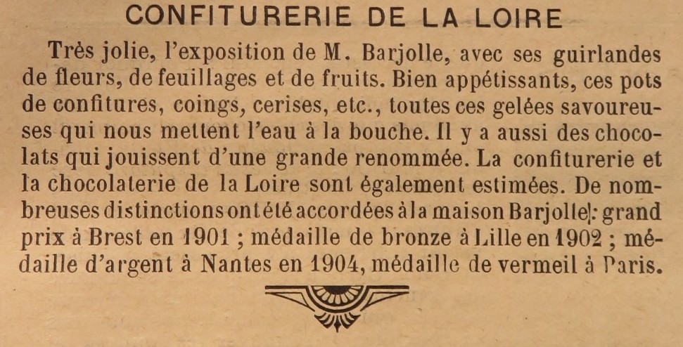 Plus loin au vu de l’affluence à son comptoir de vente « la chocolaterie et confiturerie de la Loire » connaît un succès certain. D’ailleurs le journal de l’exposition que Pierre vient d’acheter en fait l’éloge.