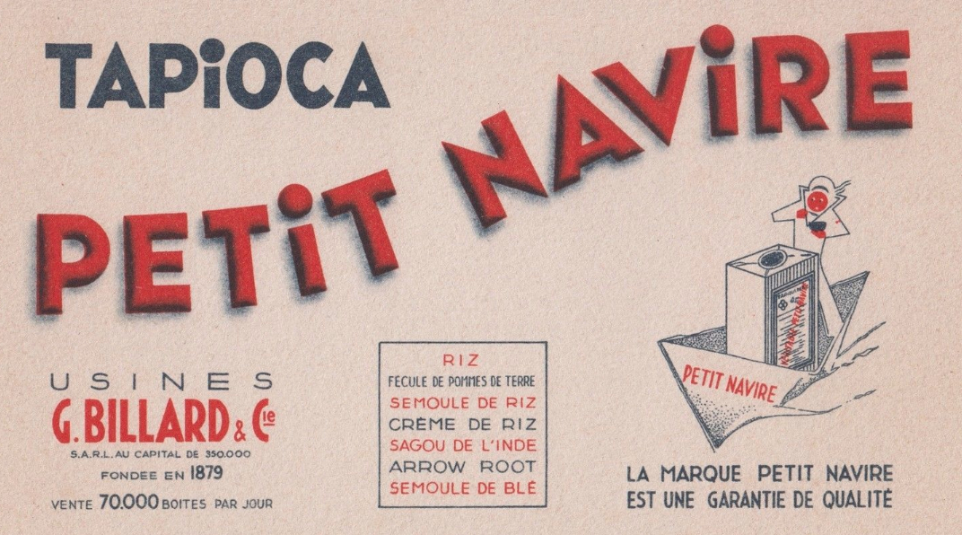 Plus loin le regard de Pierre est attiré par des grands pains de sucre blanc de la raffinerie Corhumel, maison qui « emploie exclusivement du sucre de canne, infiniment supérieur au sucre de betterave, moins sucrant et moins agréable au goût » dit la publicité affichée. A côté la maison Billard présente sa production de Tapioca dans des toiles de jute et boites de couleur différentes suivant leur origine : La Réunion, Jamaïque ou Brésil et leur marque de référence « petit navire ».