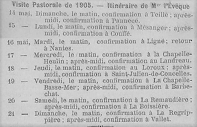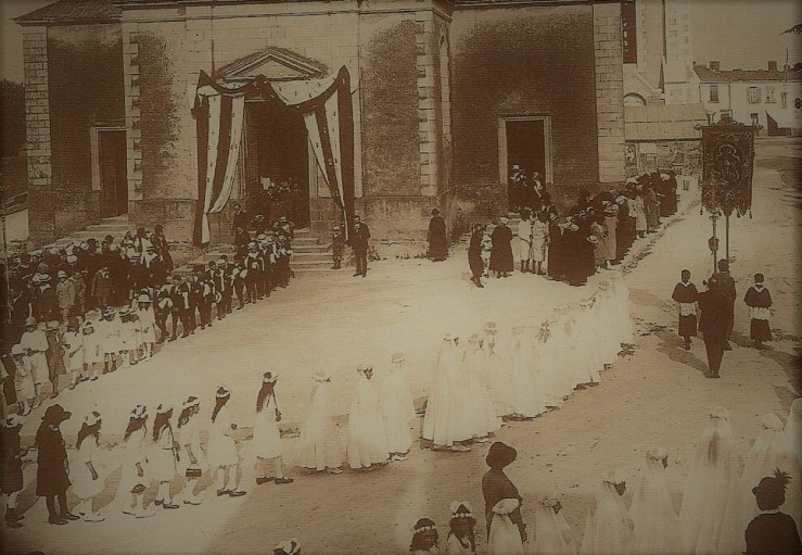 Le repas pourtant copieux doit être assez vite expédié car il faut retourner à l’office l’après midi. Ce jour de l’Ascension les vêpres sont remplacées par la cérémonie de confirmation célébrée l’évêque Pierre-Émile ROUARD, à côté du vieux curé TORELLE et des deux vicaires, DIAIS et CASSARD. Gabrielle y retrouve ses deux amies, les deux Marie, ALLEAU et COURGEAU.