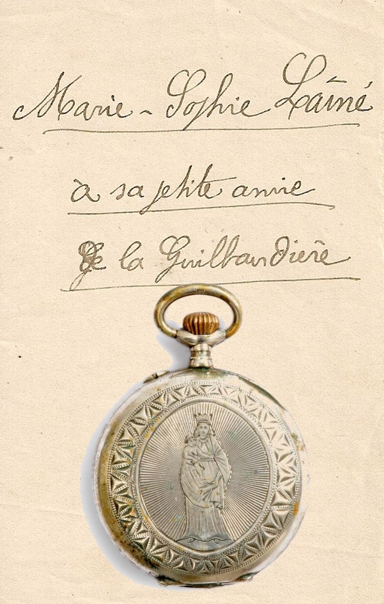 Gabrielle est ainsi la reine de la journée réunissant majoritairement les BRETONNIÈRE, la famille PETARD se résumant à Marie Pétard et son mari Auguste HIVERT. Reine de la journée, Gabrielle se tient à table entre son parrain Auguste BRETONNIÈRE et sa marraine Marie Pétard, la femme d’Auguste.Gabrielle est émue de recevoir de ceux-ci une chaîne avec une croix et un chapelet. Ses parents, de leur côté, lui ont fait graver un missel avec ses initiales.