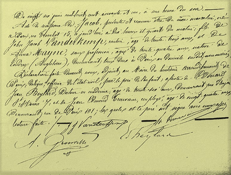 « Bien que médecin, mon père n’a pas eu besoin d’exercer son art… Il était d’une nature un peu bohême. Il prétendit faire, avec sa femme, un pèlerinage aux sources. Tous deux ne devaient passer en Europe que quelques semaines, mais le voyage s’est prolongé. Mes parents séduits par Paris, éblouis peut-être par les lumières alors incomparables de la ville, n’ont plus souhaité s’en éloigner. Finalement, ils ont fait l’acquisition d’une maison à Neuilly et s’y sont installés[4]. Voilà pourquoi mon cher Pierre, je suis né à Paris en 1861 et j’ai hérité du deuxième prénom de mon père : Jacob ».