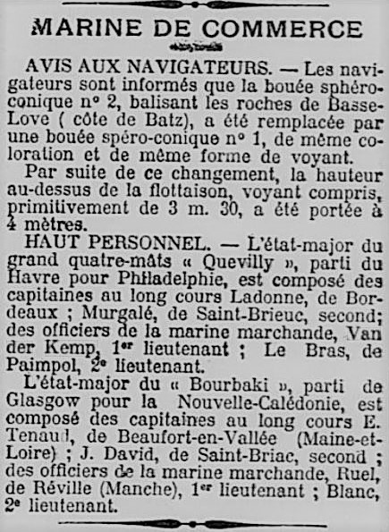 Pierre n’a pas le temps de répondre par la négative que Jacob enchaîne : « Il est un jeune lieutenant de 23 ans et vient de repartir à nouveau sur un pétrolier 4 mâts « Le Quévilly » qui transverse l’Atlantique poussé par la force du vent pour rejoindre… Philadelphie, la terre de nos ancêtres. Un retour aux sources familiales en quelque sorte ! » ajoute Jacob rieur, en présentant à Pierre un extrait du journal du mois dernier.