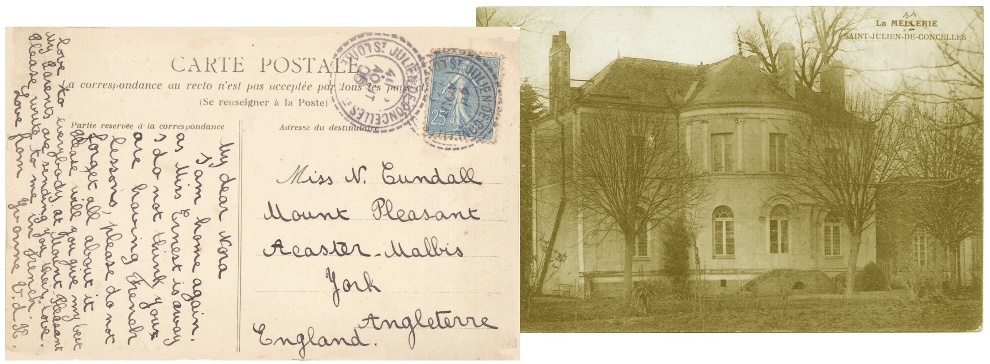 Pierre ne refuse pas ensuite l’invitation faite par Jacob de visiter la vaste gentilhommière. En passant dans la bibliothèque, Pierre salue Jeanne, la femme de Jacob et leur fille âgée de 14 ans : « nous sommes en train de terminer la rédaction d’une lettre à une lointaine cousine anglaise d’Yvonne avec laquelle elle entretien une correspondance régulière » remarque Jeanne qui ajoute en souriant : « nous avons la chance d’avoir des cartes postales de la Meslerie mais hélas certaines avec une faute d’orthographe…»