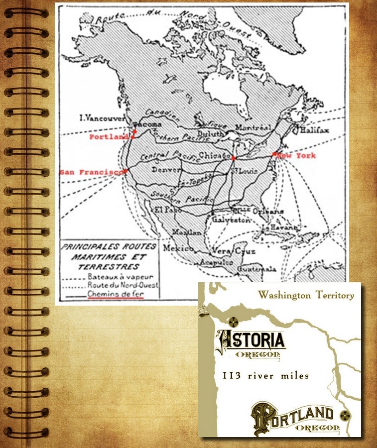 Après avoir longé le Chili puis franchi une nouvelle fois l’équateur, des vents variables nous ont conduit jusqu’à l’embouchure du fleuve Columbia, dans la rade d’Astoria. Le Cornulier prit alors son mouillage sur ses ancres en attendant le remorqueur qui devait nous conduire à Portland, distant de plus de cent soixante kilomètres en amont du fleuve ».