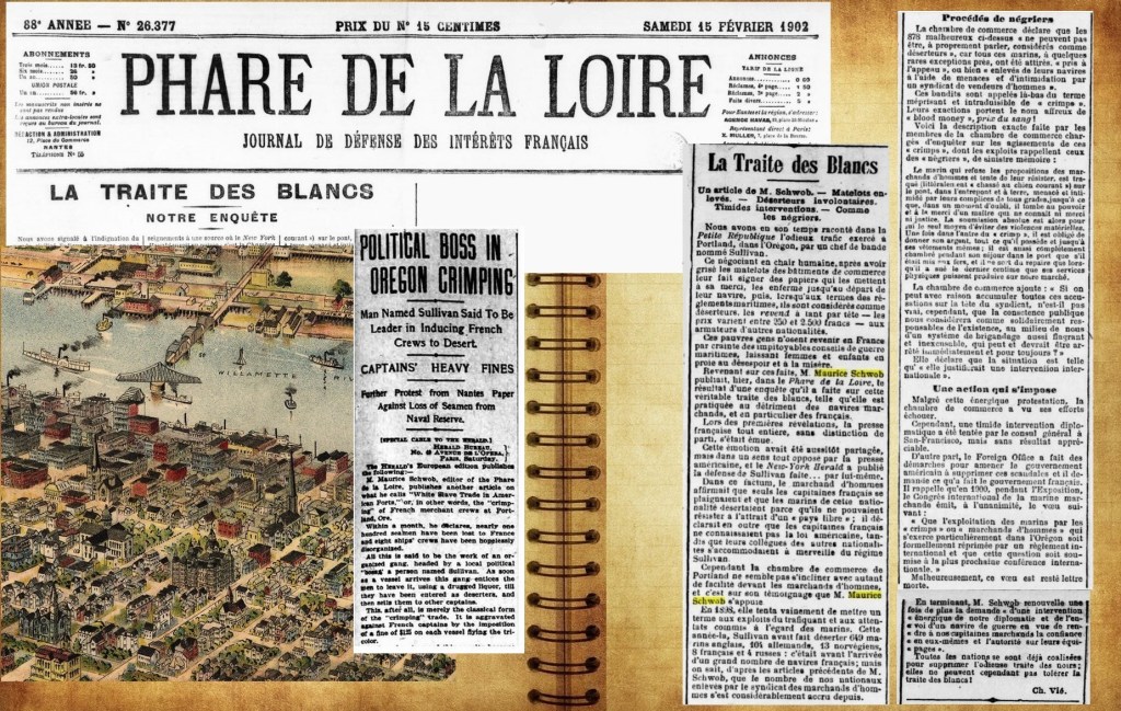 Dans ces bars où toutes les nationalités se côtoyaient, on y rencontrait étonnamment des gens nous offrant à boire gratuitement en nous demandant si nous nous plaisions à bord de notre navire et s’intéressant au montant de notre salaire. Le lieutenant m’expliqua « que le manque de main d’œuvre est criant sur place et que l’on paie même des agents pour leur recruter de la main d’œuvre qui manque dans le pays… Parfois on saoule certains hommes qui se réveillent à bord d’un baleinier en partance pour la pêche dans le détroit de Behring ou les côtes de l’Alaska, d’autres sont attirés par les hauts salaires promis pour l’abattage de bois… On dit ainsi que l’équipage de tel navire a été “shangaïé”… ». Puis parlant à voix basse le lieutenant ajouta : « cette désertion est organisée ici par le maire de la ville, Sullivan, propriétaire de plusieurs bars et également chef de la police locale…