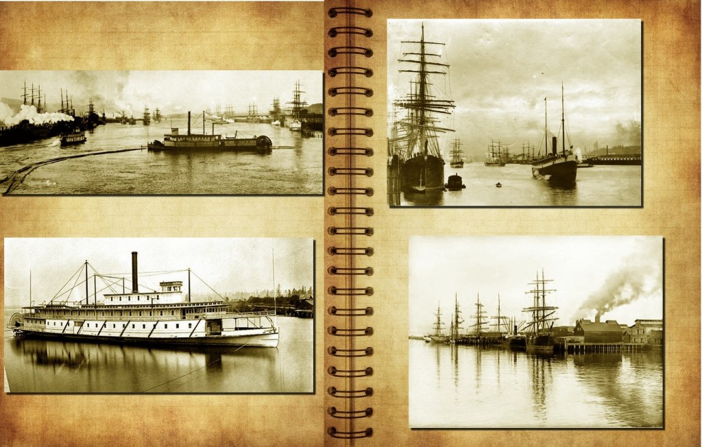 En descendant le fleuve j’ai vu que les deux rives étaient couvertes d’immenses forêts de sapins. Arrivé à Portland les quais étaient encombrés de navires de toutes nationalités, opérant chargements et déchargements de leur cargaison. Les quais du port étaient faits de constructions rudimentaires, constitués par des poteaux enfoncés profondément dans la vase du fleuve et servant de supports à des madriers cloués horizontalement formant le quai de déchargement.
