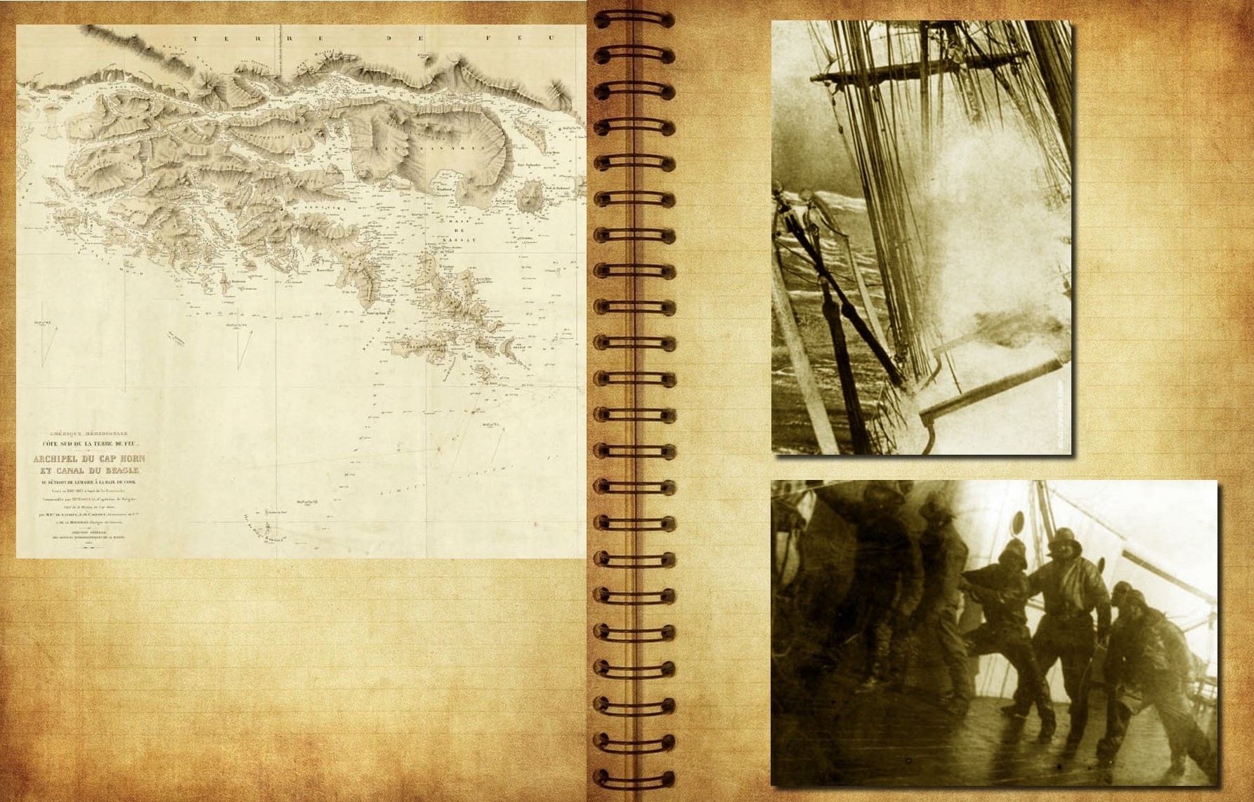 « Le voyage se déroulera correctement jusqu’à la latitude de Buenos aires où nous avons dû affronter comme le « Pierre Loti » qui nous suivait, les redoutables « pamperos ». Là, Il a fallu toute la présence d’esprit du capitaine Rio pour nous mettre sous une voilure réduite dans cet ouragan afin d’éviter d’arracher nos voiles… Une belle préparation au passage du cap Horn quelques jours plus tard, cet archipel dont l’île extrême sud est un immense rocher surplombant la mer de plus de 400 mètres. La région est un immense cimetière de navires de toutes nationalités du fait du danger de la mer et des icebergs