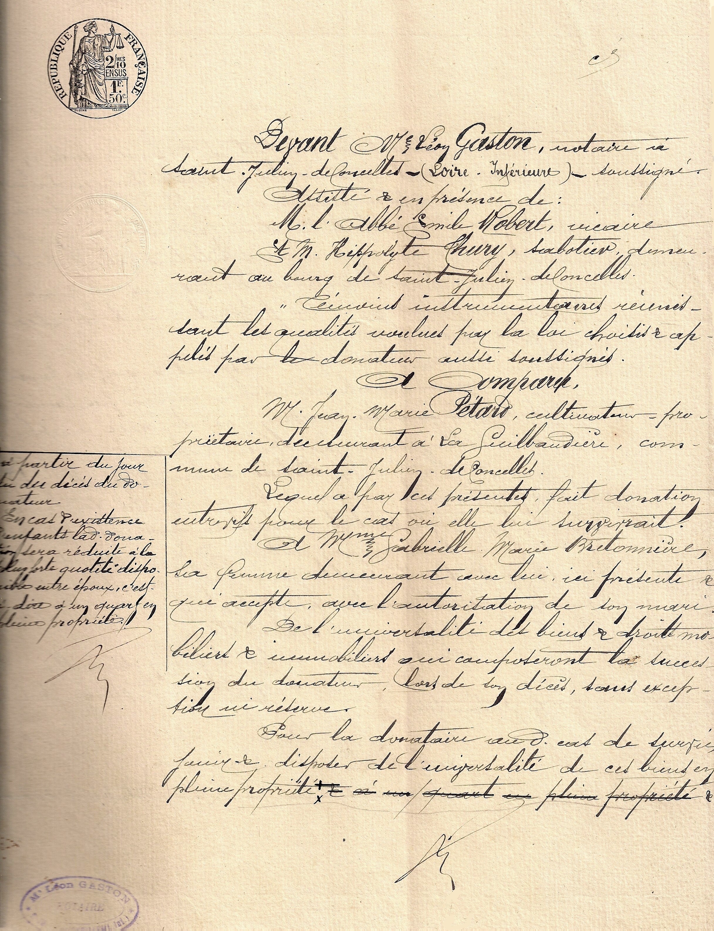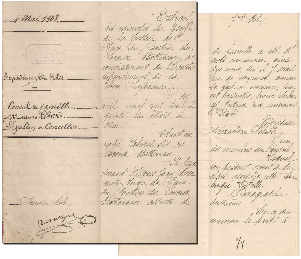 C’est Alexandre PÉTARD, cousin et voisin de la Guilbaudière qui est choisi comme tuteur des mineurs par le conseil de famille. Il sera donc à côté de Gabrielle pour faire, avec le notaire Léon Gaston, le 13 mai 1908, l’inventaire des biens immeubles et animaux et finir de payer les dernières factures à Léon THOMAS le maçon et Louis HALLEY le forgeron pour la rénovation de la maison débutée l’an dernier.