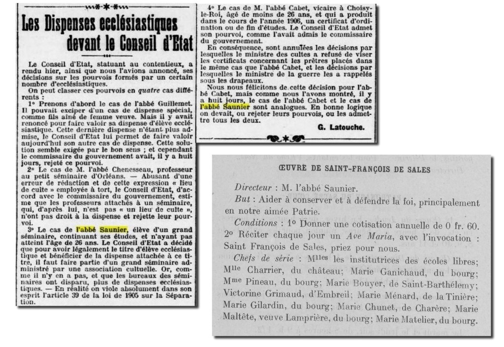 Certains esprits mal intentionnés ont raconté que le nouveau vicaire a poursuivi ses études pour échapper à la conscription en faisant circuler un article concernant sur une dispense ecclésiastique jugée devant le Conseil d’État … Auguste SAUNIER a dû expliquer qu’en 1902, il a bien été dispensé du service mais à cause d’un « état de santé fébrile ».