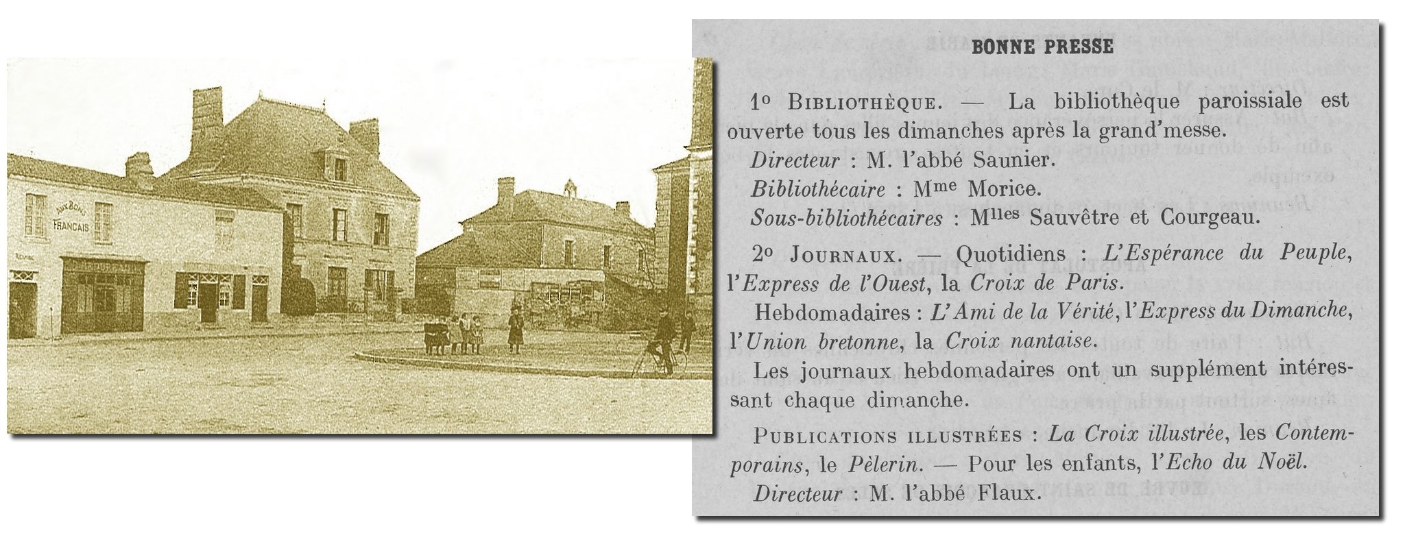 Au cours de cette année 1910, le vieux curé TORELLE est décédé, remplacé par le curé PENEAU venu de Nantes-Doulon. Ils sont deux vicaires avec Raymond FLAUX. De son côté l’abbé SAUNIER s’est très vite investi dans les actions culturelles de la paroisse. Il est « directeur » de la société musicale et de la bibliothèque paroissiale, et pour les jeunes hommes, responsable du « catéchisme de persévérance » et du « patronage du sacré cœur ».