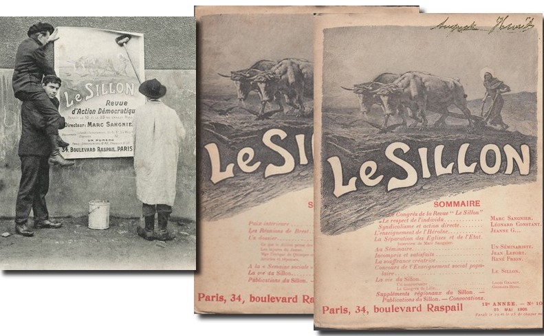 Au départ un groupe de jeunes bourgeois parisiens, catholiques épris des idées républicaines qui veulent tracer une voie entre la droite catholique et ses opposants les plus farouches, les socialistes anticléricaux. En 1893, ils tiennent des réunions dans la crypte du collège Stanislas de Paris et l’un d’entre eux, Paul RENAUDIN crée la revue « Le Sillon » qui prend vite une ampleur extraordinaire. En effet le journal s’inscrit dans un christianisme social, rallié à l’esprit républicain et promeut un catholicisme progressiste et démocratique.